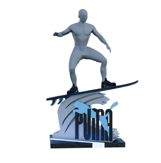 This project combines an exterior redesign with three dynamic hero installations for Puma. The storefront adopts a clean, bold façade that elevates brand visibility, while inside, sculptural displays bring sports energy to life. A wave-riding surfer, neon-framed runners, and a kayak-ski duo each embody Puma’s Forever Faster ethos through motion-inspired forms and illuminated geometry. These installations blur retail and spectacle—turning the store into both a branded landmark and an experiential stage. Together, the façade and hero pieces create a cohesive narrative of speed, agility, and athletic performance that reinforces Puma’s identity inside and out.